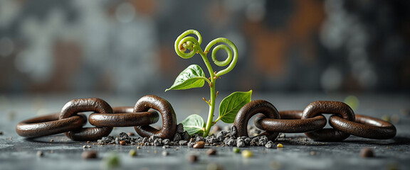 Close-up view of weathered, rusty metal chain links with circular eyelet fasteners, set against a blurred background of lush greenery, highlighting the aged texture and intricate details of the...