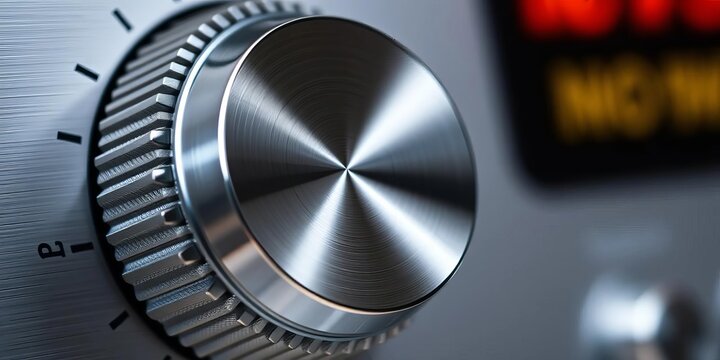 Close-up of a metallic volume knob, showcasing its textured surface and rotary dial,   retro,  scale
