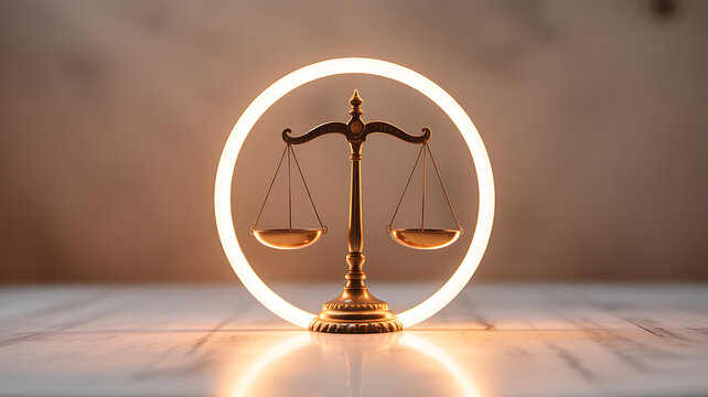 Golden scale of justice illuminated by a glowing circular light on a wooden surface