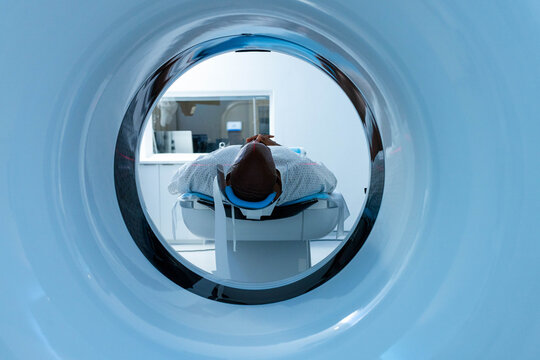 African American woman lying on scanner table at hospital, wearing patterned gown and foam headrest