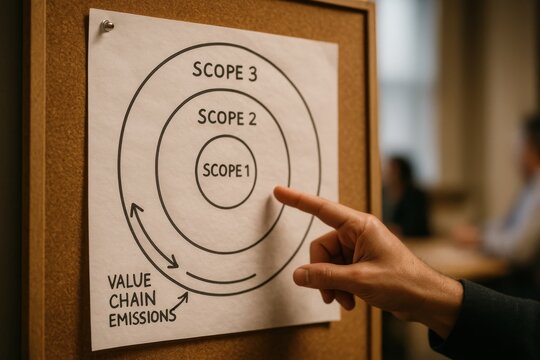 Close-up of diagram showing Scope 1, Scope 2, and Scope 3 emissions with a hand pointing at the Scope 3 zone on a corkboard.