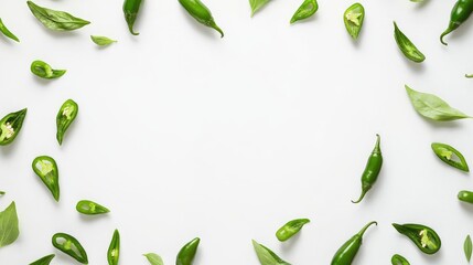 Fresh jalapenos arranged on a white background creating a circular frame with ample empty space for text or branding purposes