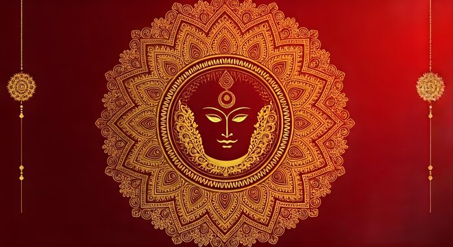 Golden face of Hindu Goddess Durga in an intricate mandala on a festive red background.