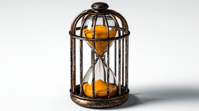 A vintage hourglass encased in a decorative cage, symbolizing the confinement of time with a golden sand flow.