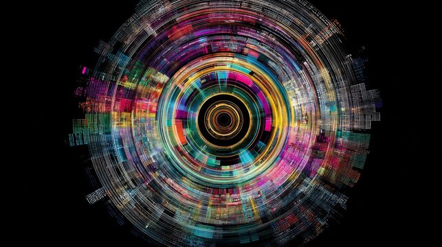 Animating central circular HUD interface on dark grid, with waveform data streams and readouts
