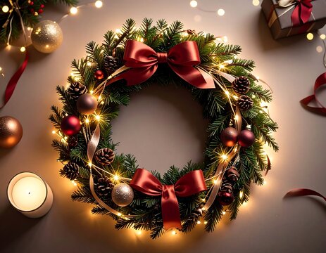 Festive grapevine wreath with red ribbon on rustic wooden plank