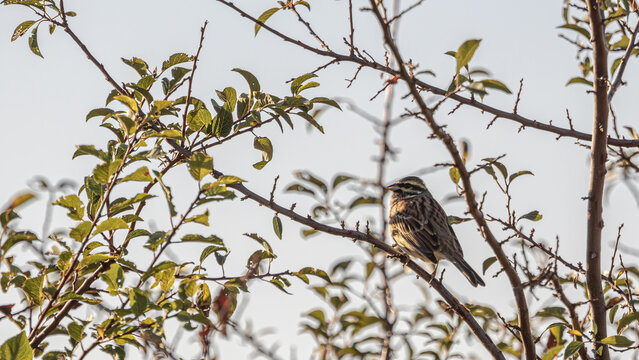 A small bird perched on a tree branch against a clear blue sky. The cirl bunting (Emberiza cirlus), is a passerine bird in the bunting family Emberizidae