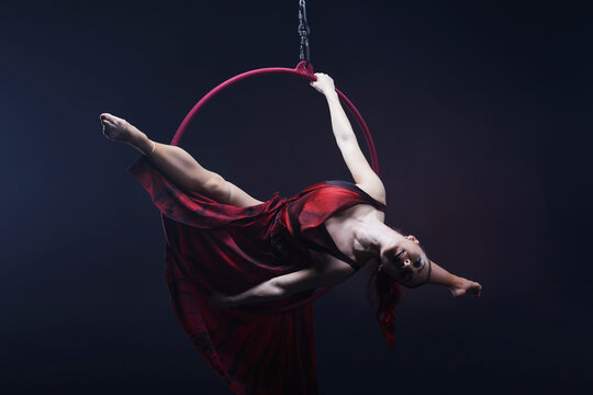 Circus performer woman in red dress doing tricks on red Lyra isolated on black background.