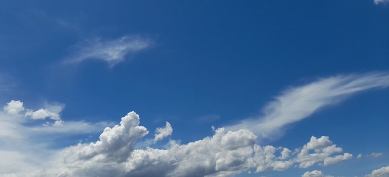 Blue sky with white cirrus clouds sunny panorama.