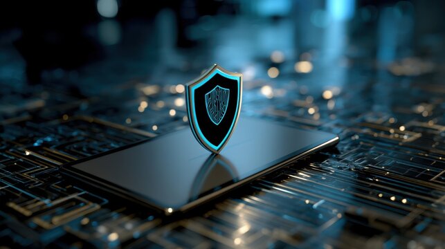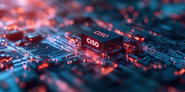 Cybersecurity Concept with CISO Shield on Digital Tablet and Futuristic Circuit Board Background Highlighting Data Protection.