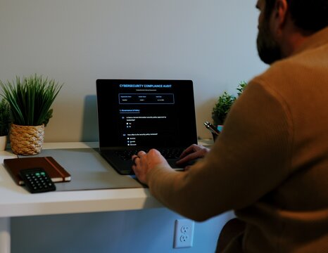 Middle Aged Man Working Remotely From Home Conducting Cybersecurity Audit for Consulting Firm - Information Security Concept