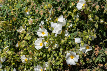 White flowers of Cistus ladanifer, flowering plant in the family Cistaceae in sunlight. Gum rockrose, labdanum, common gum cistus and brown-eyed rockrose