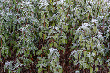 Cistus laurifolius. Rock rose shrub or mountain steppe shrub in winter with frost.