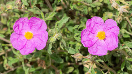 Bright pink rock-rose flower in a spring botanical garden. Cistus creticus is a species of shrubby plant in the family Cistaceae. A species of shrubby plant widespread in the Eastern Mediterranean.