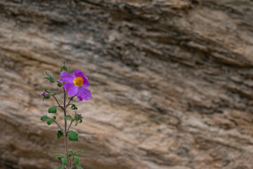 Close up of the pink flower of Cistus symphytifolius also known as Grey leaved Cistus from the Cistaceae family This species is endemic to the Canary Islands Selective focus copy space