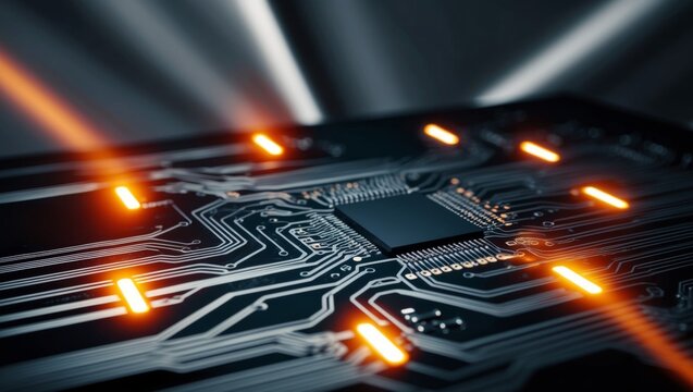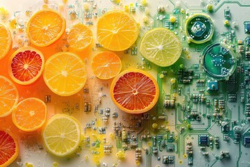 Citrus fruits arranged on a circuit board, a vibrant juxtaposition of nature and technology.