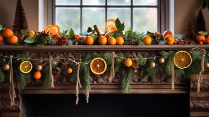 Closeup of a mantel decorated with a string of biodegradable paper garland, accented with cinnamon sticks and dried citrus peels.