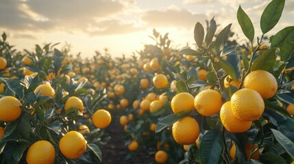 Orange Grove at Sunset – Fresh Citrus Fruit on Tree in Golden Light