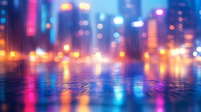 Vibrant city reflections in rainy weather create a modern abstract aesthetic