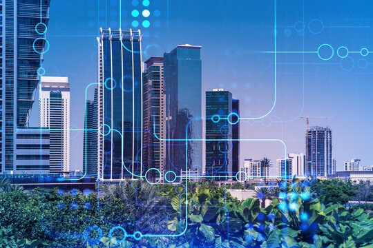 Digital data overlays on modern urban cityscape