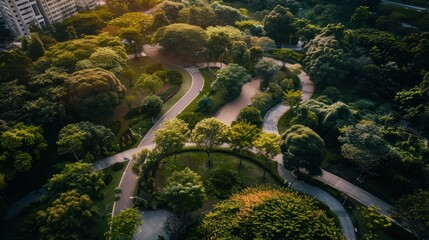 Tranquil sunset-lit green city park with winding paths, seen from above, offering a peaceful escape from the urban bustle