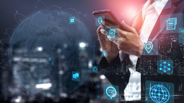 A hand interacts with a futuristic digital interface, showcasing data visualizations and global network connections against a blurred cityscape backdrop at night. : Generative AI