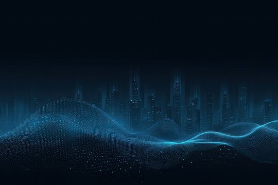 Digital city skyline scene, with glowing wave overlay, evoking data flow and tech growth