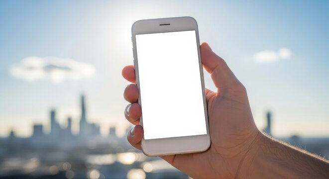 Hand Holding Smartphone with Blank Screen Against Cityscape, Technology Concept