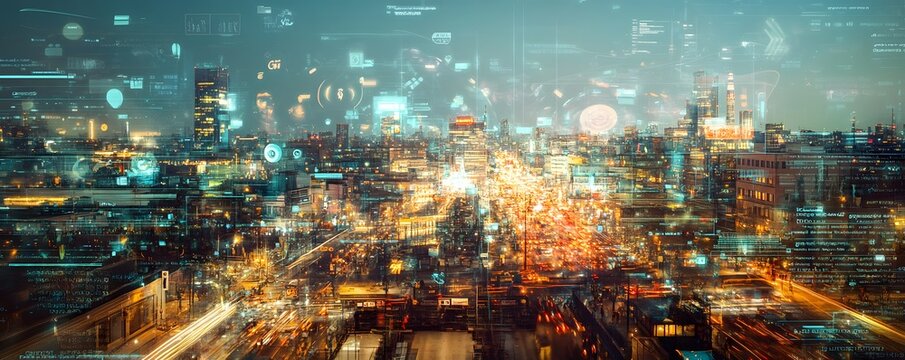 Futuristic cityscape integrates technological overlays and glowing traffic patterns