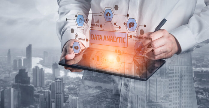 A professional interacts with a digital tablet showcasing data analytic graphics above an urban cityscape, merging technology with business innovation and insights. Tessel