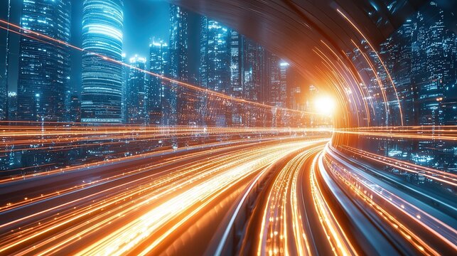 Futuristic cityscape with glowing light trails and skyscrapers at night.
