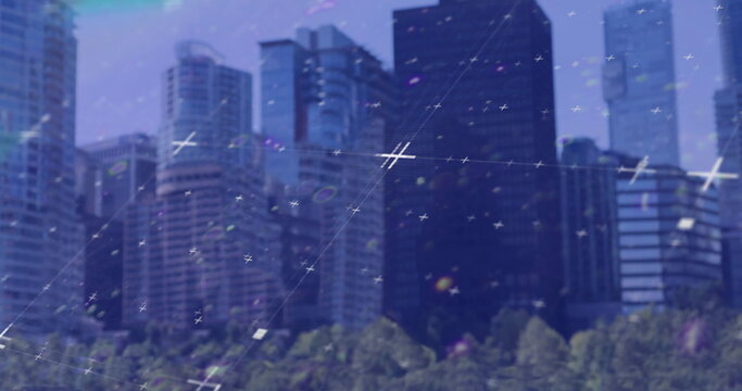 Image of financial data processing over cityscape