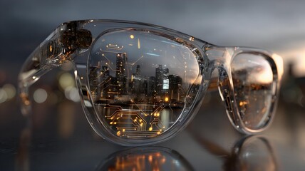Futuristic smart glasses with glowing circuits reflect a neon cityscape. A vision of augmented reality, where digital layers blend seamlessly with the physical world.