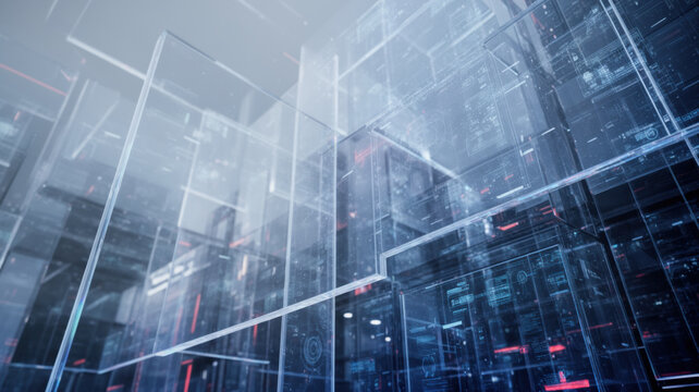 Futuristic technology background layered transparent digital cube structure data network abstract cityscape immersive