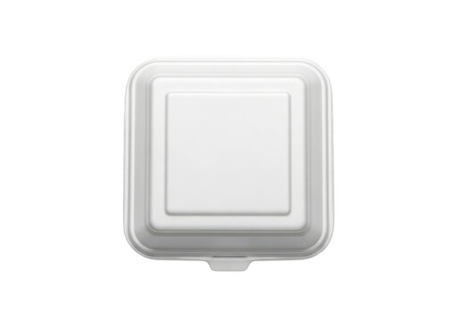 Square, white clamshell food container with a hinged lid, partially closed on black