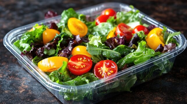 Fresh Salad in Clear Plastic Container with Yellow and Red Tomato on Dark Table