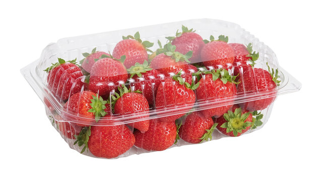 High-Resolution PNG of Fresh Strawberries in a Clear Plastic Clamshell Container - Three-Quarter View