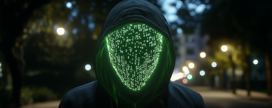 Mysterious hooded figure with intense moody lighting and futuristic digital atmosphere  Concept of cyber security hacking or shadowy clandestine activities