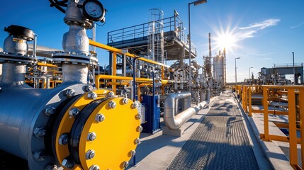Industrial plant with silver pipes and yellow flanges against a bright blue sky with sun