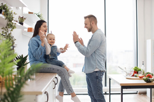 Beautiful brunette woman sitting on countertop with baby on laps while handsome man standing in middle of room. Funny father playing clapping game with daughter and mother in kitchen interior.