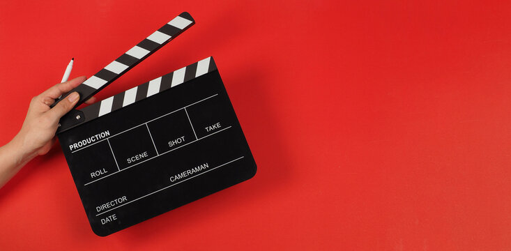 Hand is holding clapper board or movie slate or film slate.It is used in video production and cinema ,movies industry on yellow background