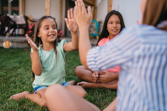 Kids enjoying clapping game outdoors on sunny day