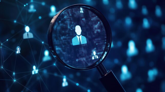 Magnifying glass focusing on digital network and human icon