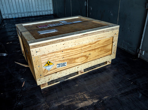 Radiation warning sign transport label Class 7 on the Dangerous goods package type A in the container of transport truck