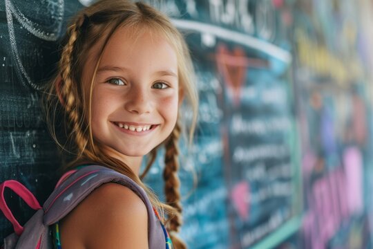 Happy young girl with a backpack standing in front of a colorful chalkboard.