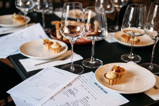 Wine workshop table set with tasting cards, desserts, and multiple glasses prepared for sensory exploration. Wine workshop, hands-on wine education, sensory analysis, sommelier training