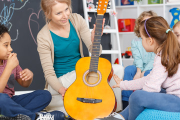 Sunlit yoga class with instructor guiding kneeling students in meditation practice