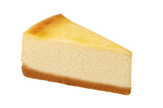 Delicious slice of classic plain New York cheesecake with a graham cracker crust isolated on a clean white background, a sweet dessert perfect for a bakery or cafe menu.