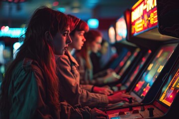 Capturing Youthful Joy: 1980s Teenagers Strike a Pose at a Classic Game Arcade for an Iconic Group Portrait