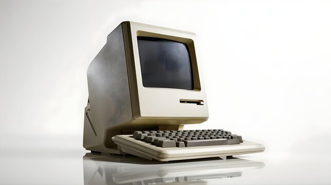 A classic retro personal computer with a CRT monitor and desktop tower isolated on a white background, representing early digital technology